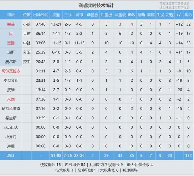 鹈鹕虽然输掉比赛,但奎因的表现更加炸裂:首发出战33分钟,投篮15中11,三分2中0,罚球13中11,狂砍33分10篮板10助攻4盖帽4失误,正负值+14。比赛第三节,奎因单节6投6中,砍下21分4板5助1帽,鹈鹕落后25分的情况下一度追平。