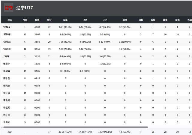 辽宁U17男篮此役4人得分上双,孙梓豪22分,张茗喆20分6篮板,宋志诚19分7篮板,高端11分2篮板4助攻,郑琪彬2分10篮板10助攻。