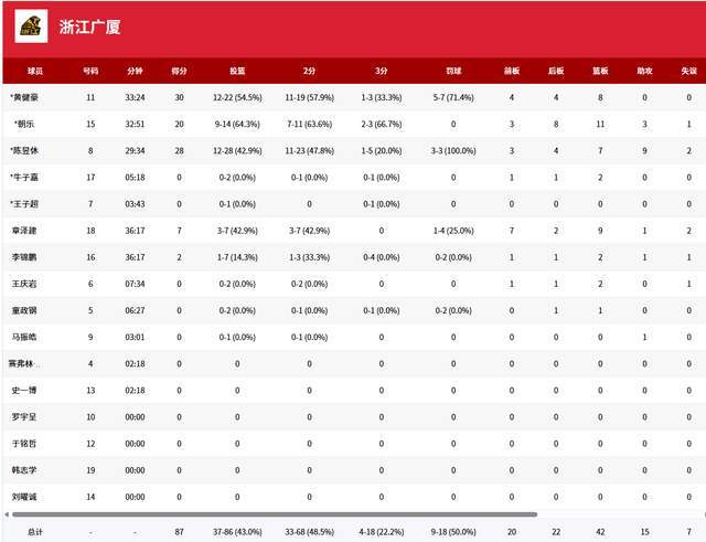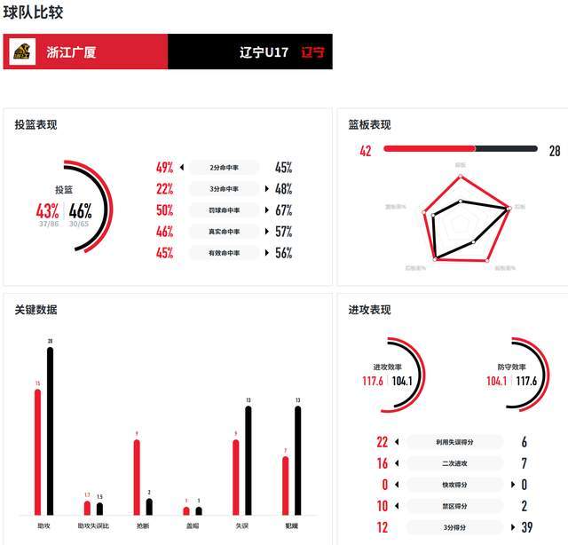 出手次数不够,命中率也无法保证去拿到更多的分数。而在护筐层面,辽宁队同样差点意思,此役只抢到28个篮板球,而广厦队42个,二次进攻机会更多。