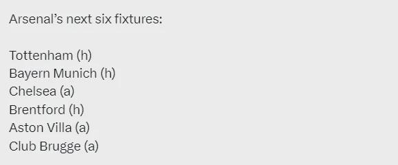 阿森纳未来6场比赛:主战热刺、主战拜仁、客战切尔西、主战布伦特福德、客战维拉、客战布鲁日。