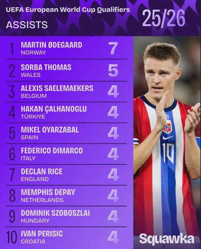 Squawka统计了世界杯欧洲区预选赛阶段助攻最多的球员数据,厄德高7次助攻领跑!赖斯4次助攻并列第三!