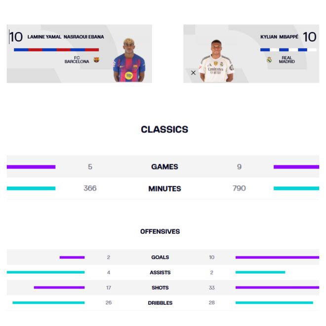 作为各自球队的王牌,两人都有在关键时刻挺身而出拯救球队的能力。姆巴佩出战9轮联赛已经斩获10个进球,是射手王;亚马尔受困伤病仅出场5次,但奉献了4次助攻,同样存在感十足。